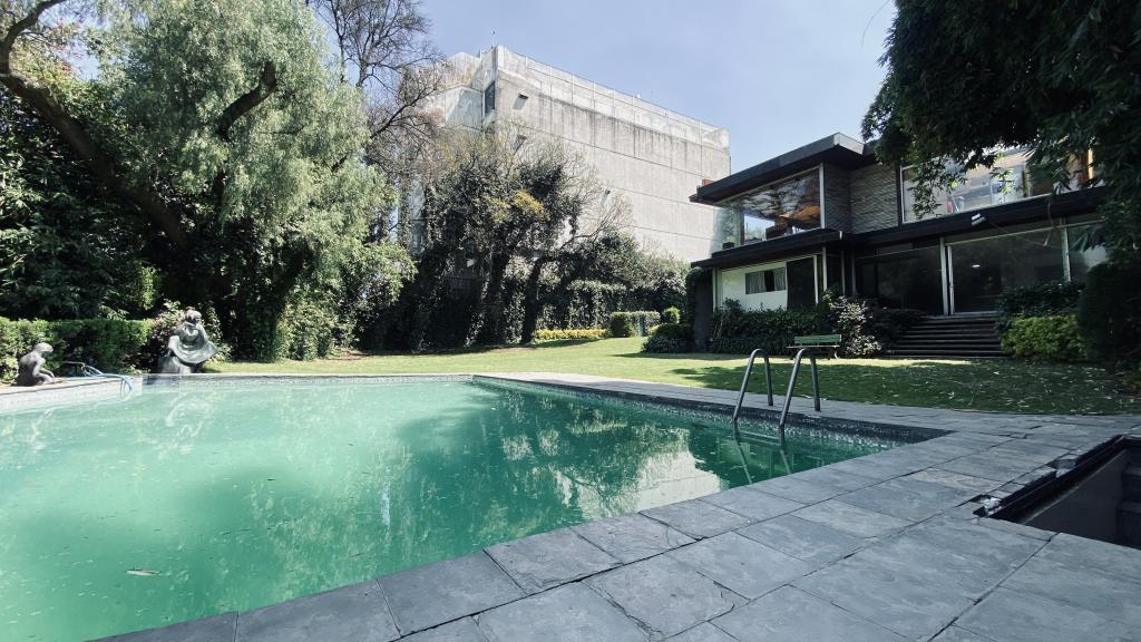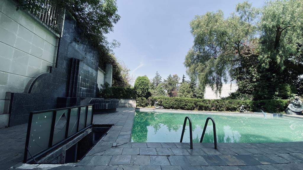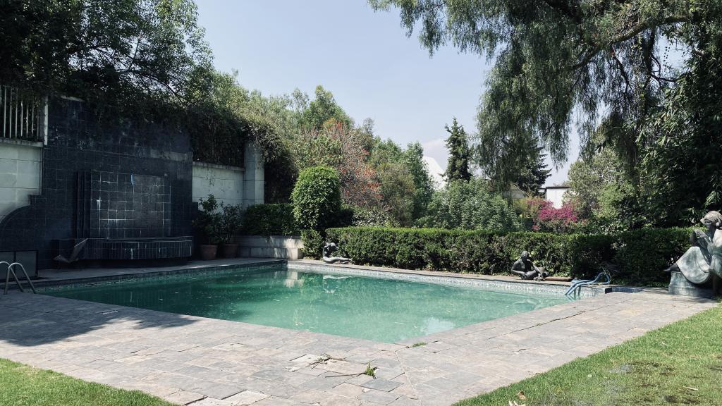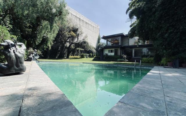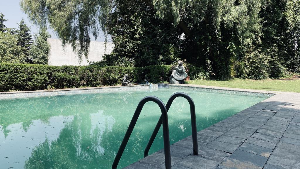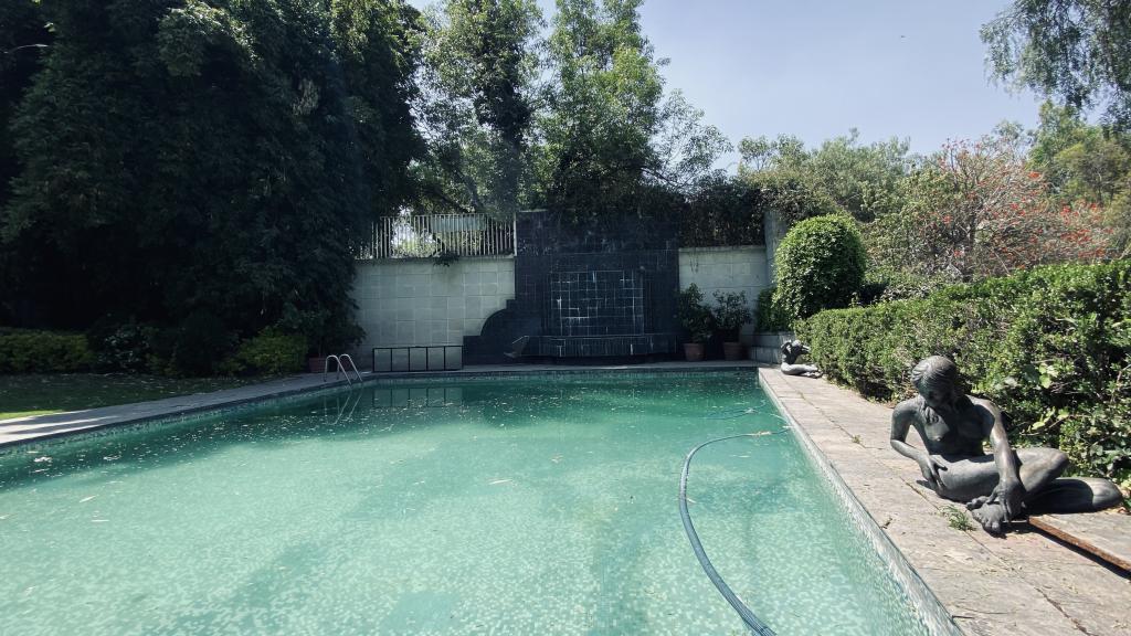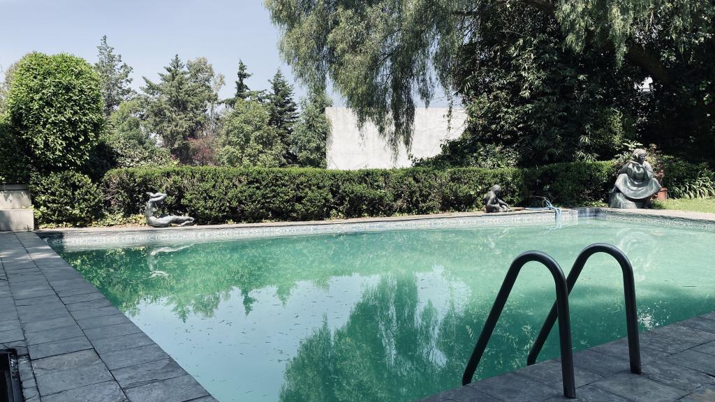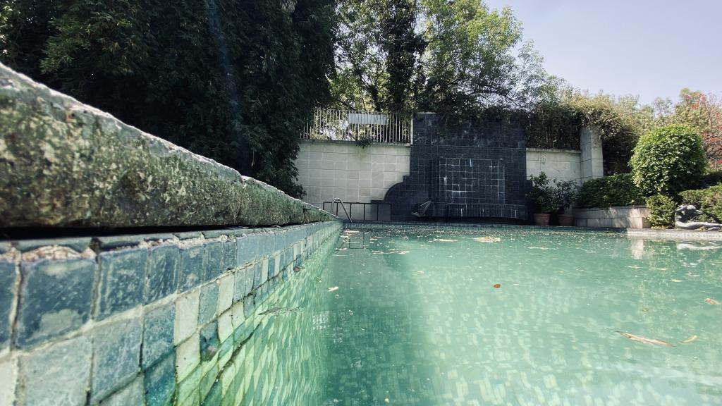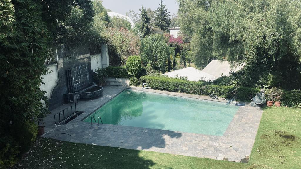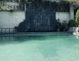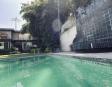 Albeerca dentro de una residencia privada. De fachada moderna. Con áreas verdes a los lados y una fuente moderna al frente de la alberca.