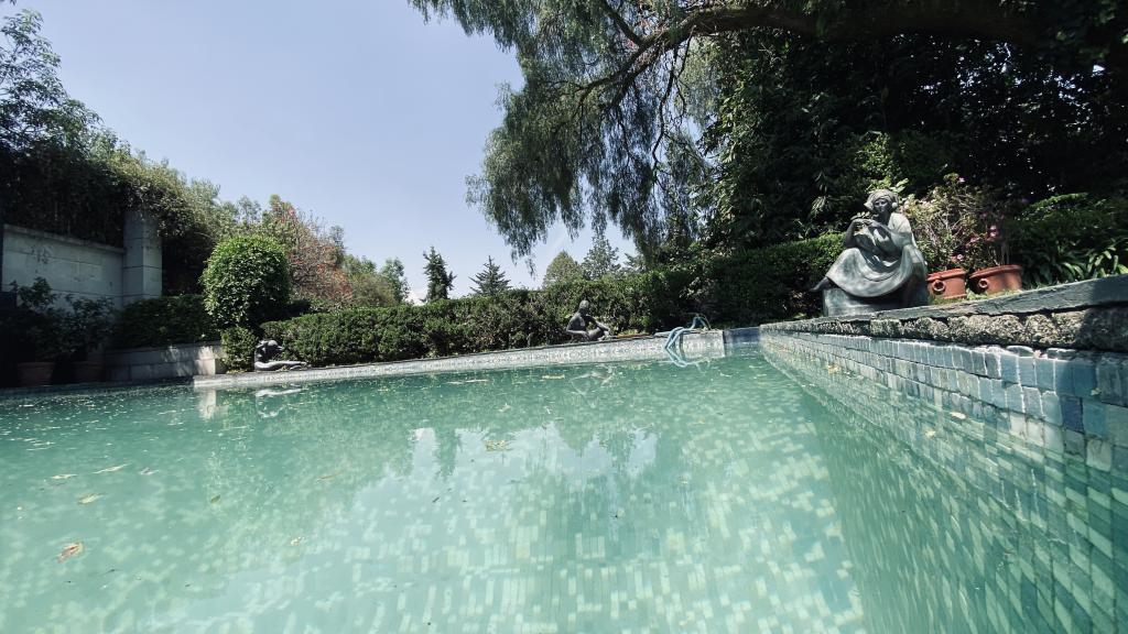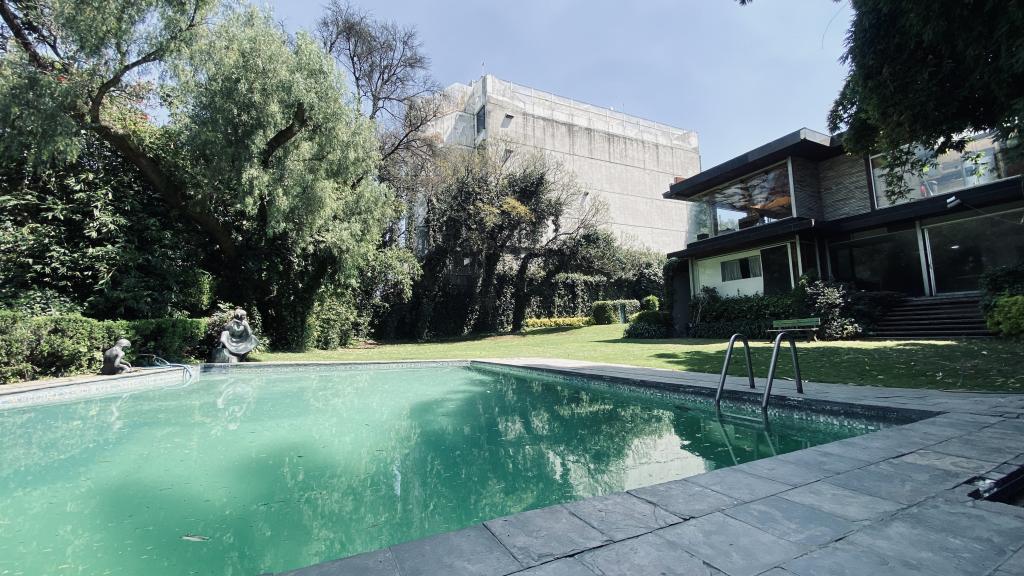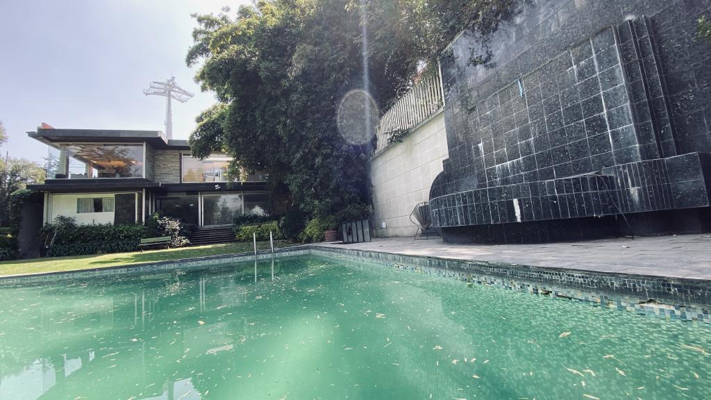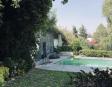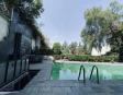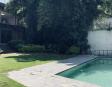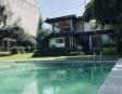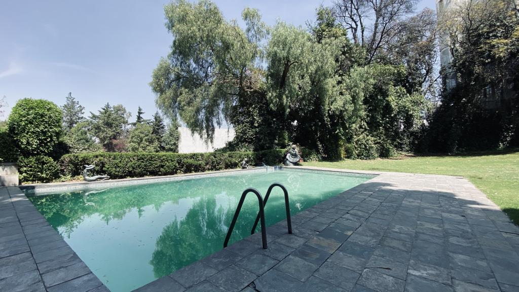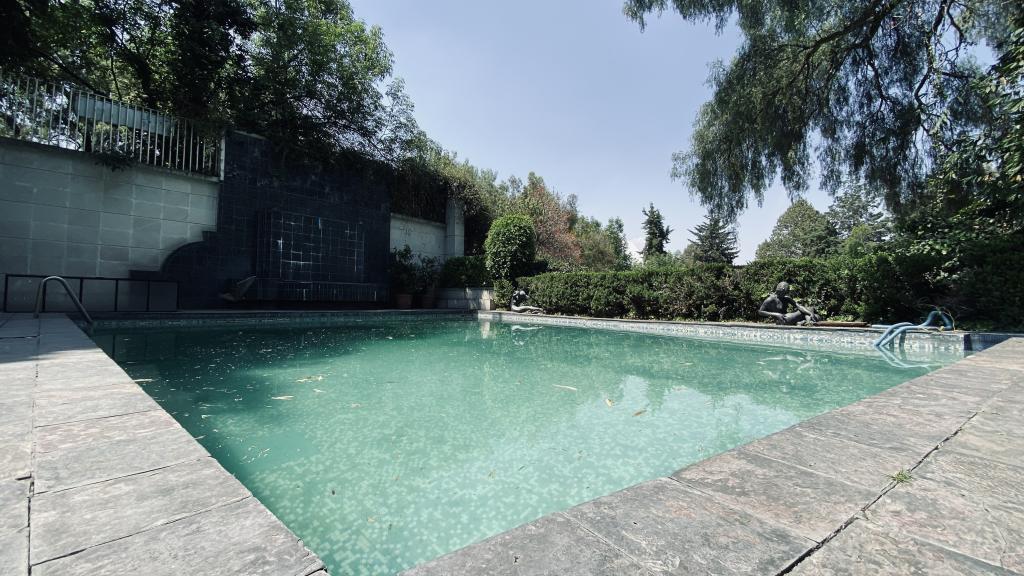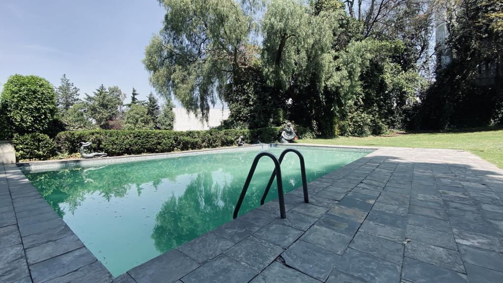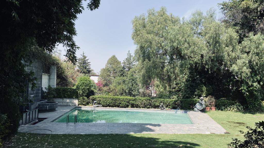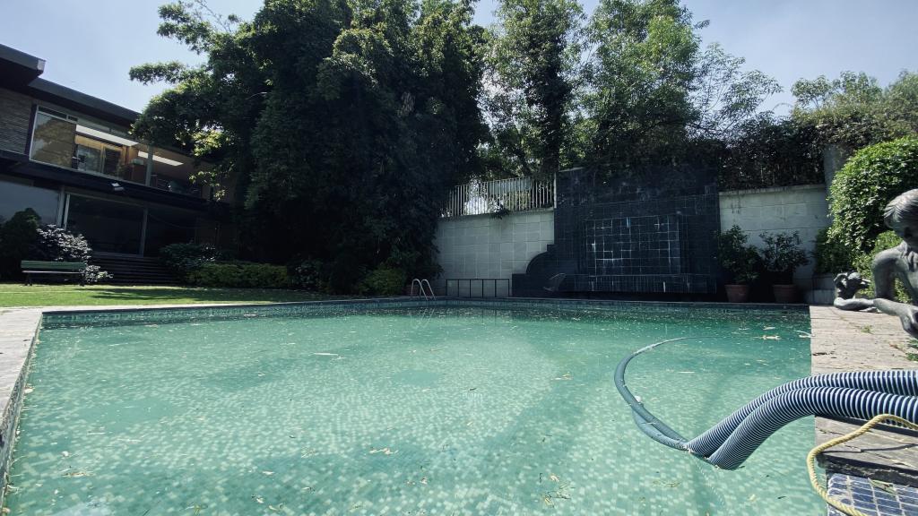 Albeerca dentro de una residencia privada. De fachada moderna. Con áreas verdes a los lados y una fuente moderna al frente de la alberca.