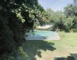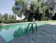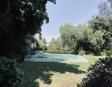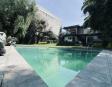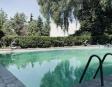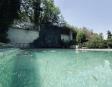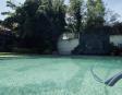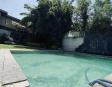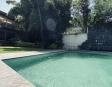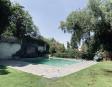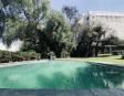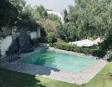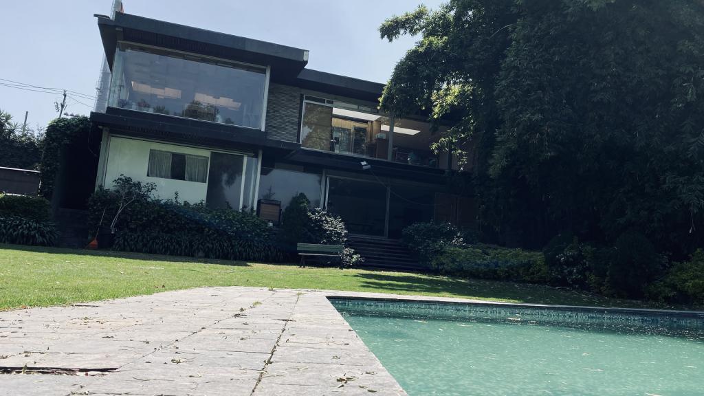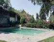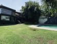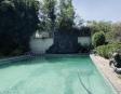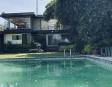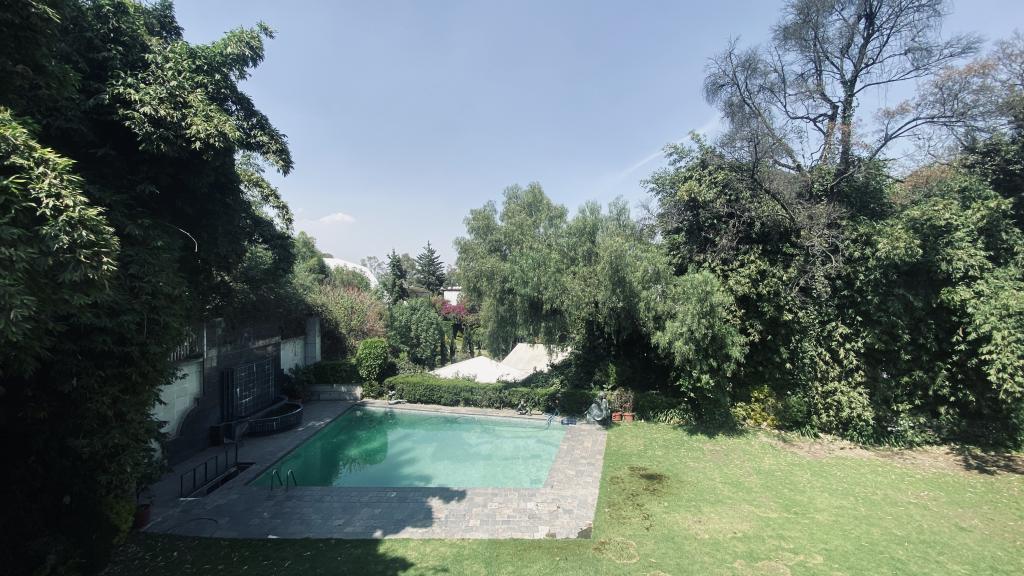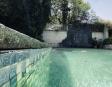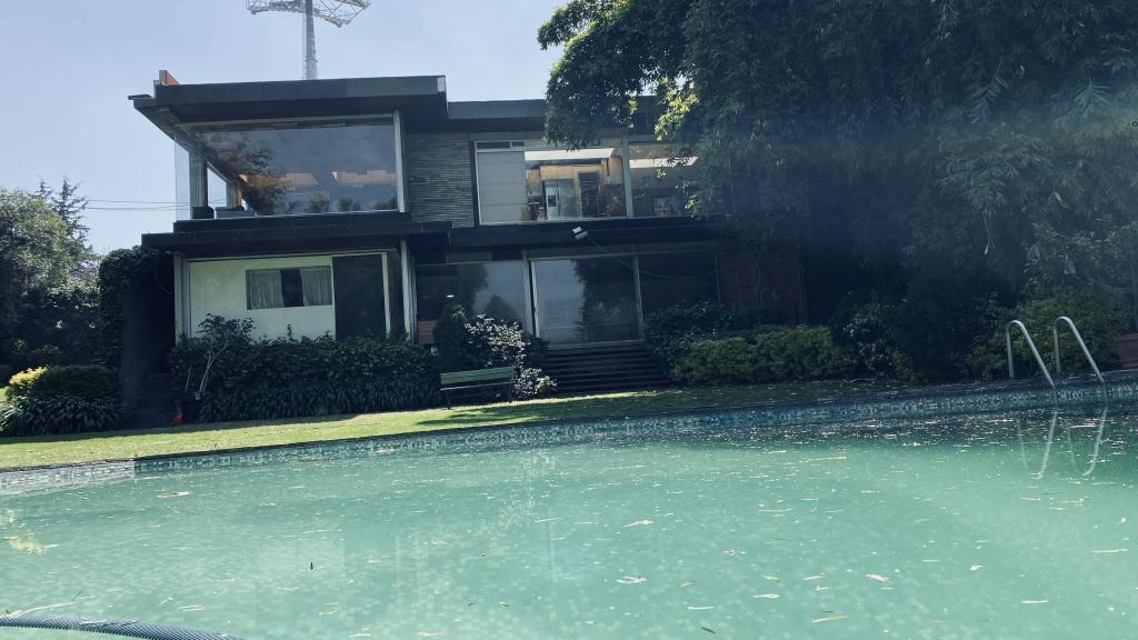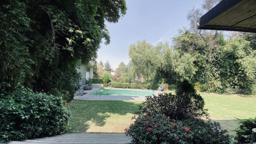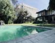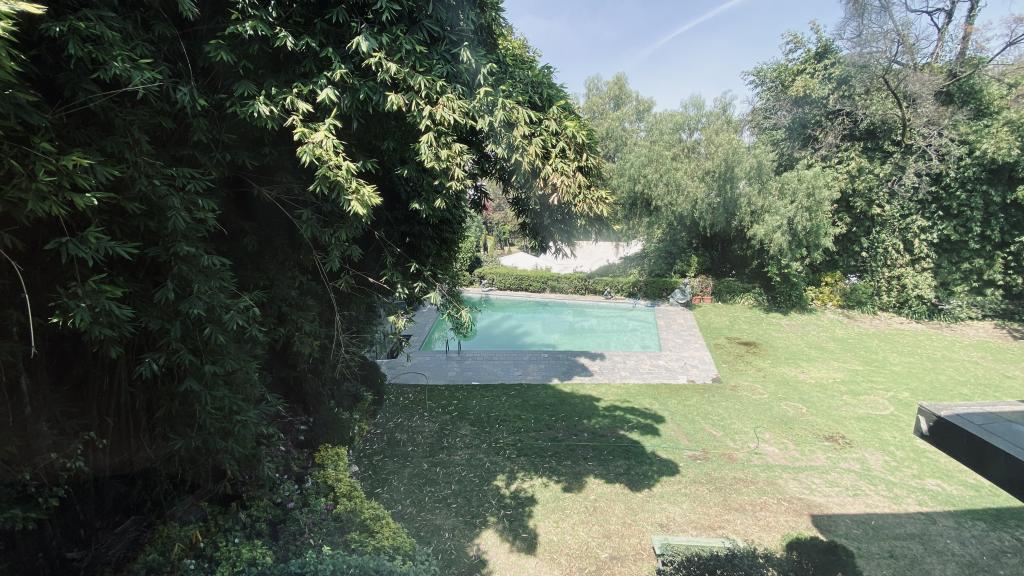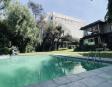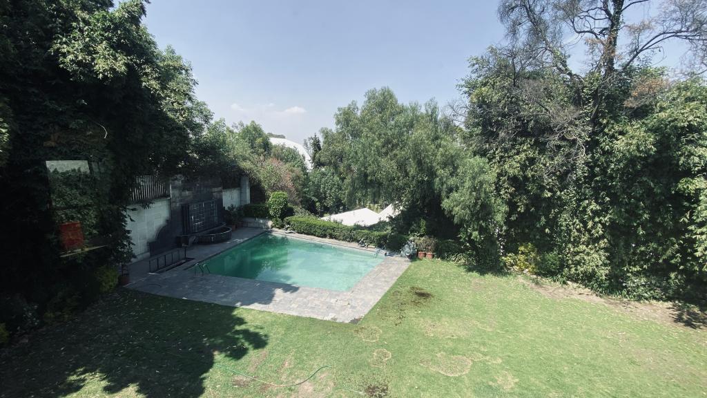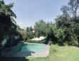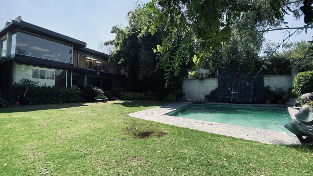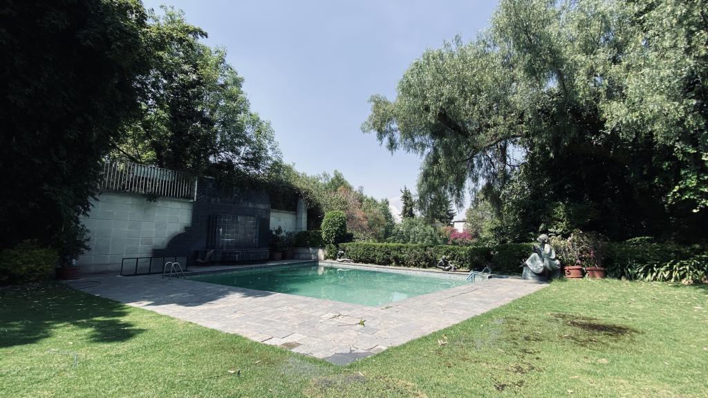 Albeerca dentro de una residencia privada. De fachada moderna. Con áreas verdes a los lados y una fuente moderna al frente de la alberca.