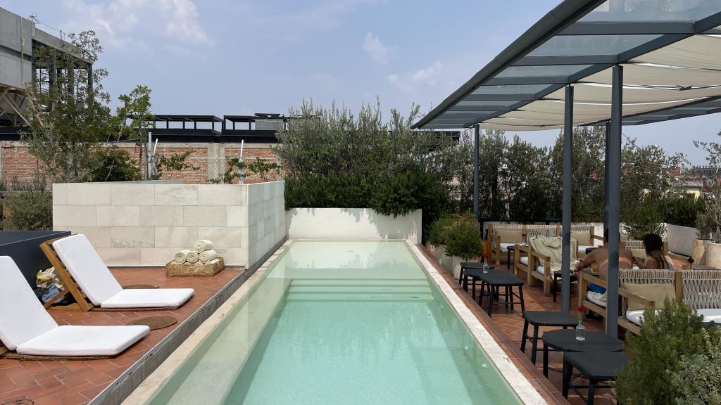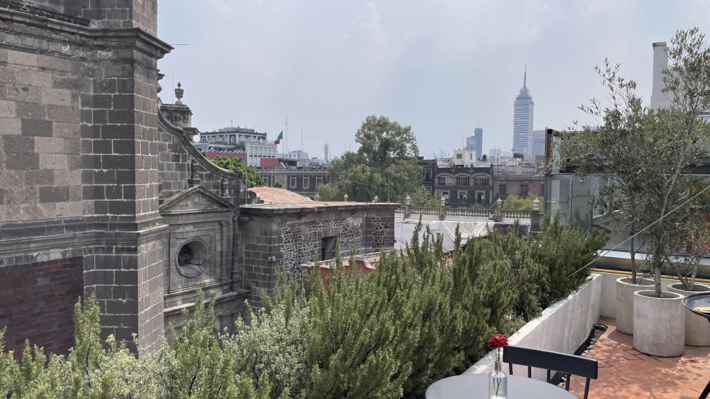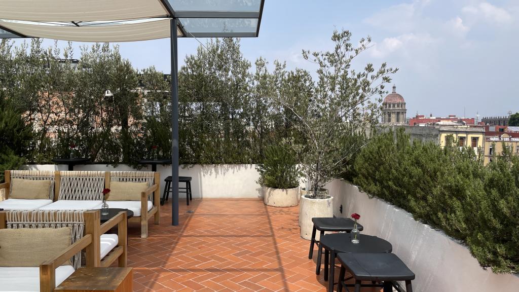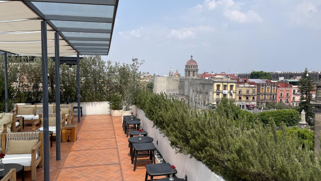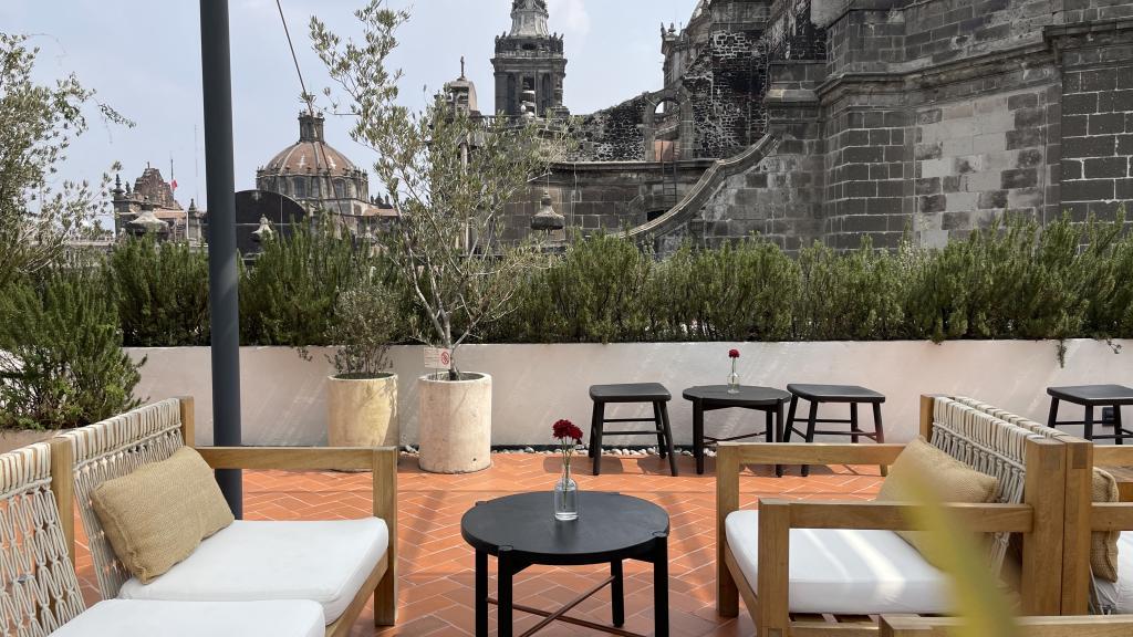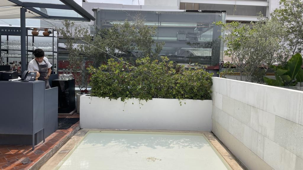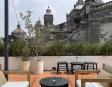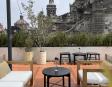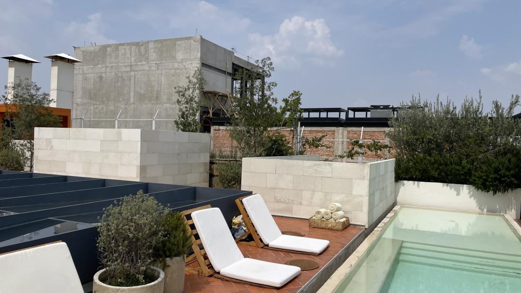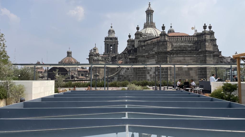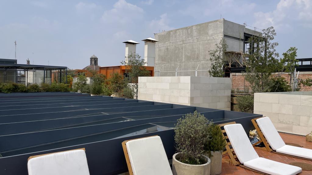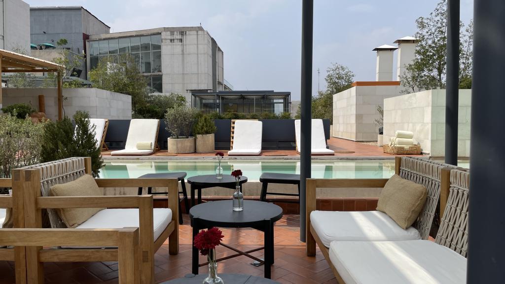 Alberca en la terraza del Hotel Círculo Mexicano, ubicado en el Zócalo de la CDMX. En edificio estilo colonial con detalles de decoración modernos.