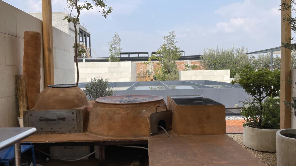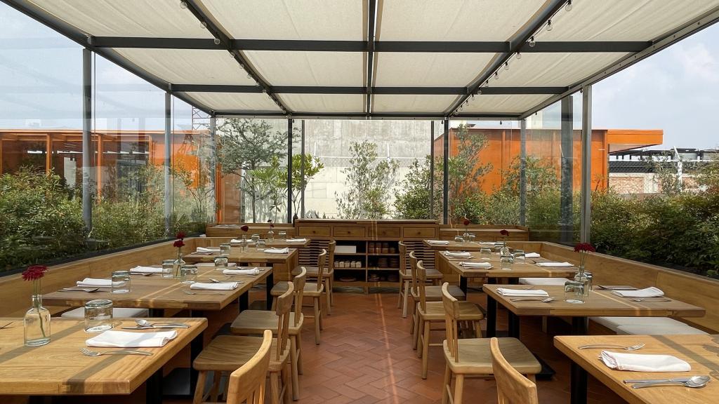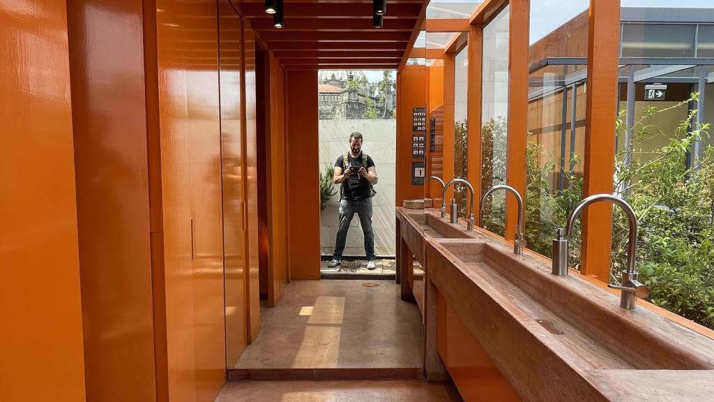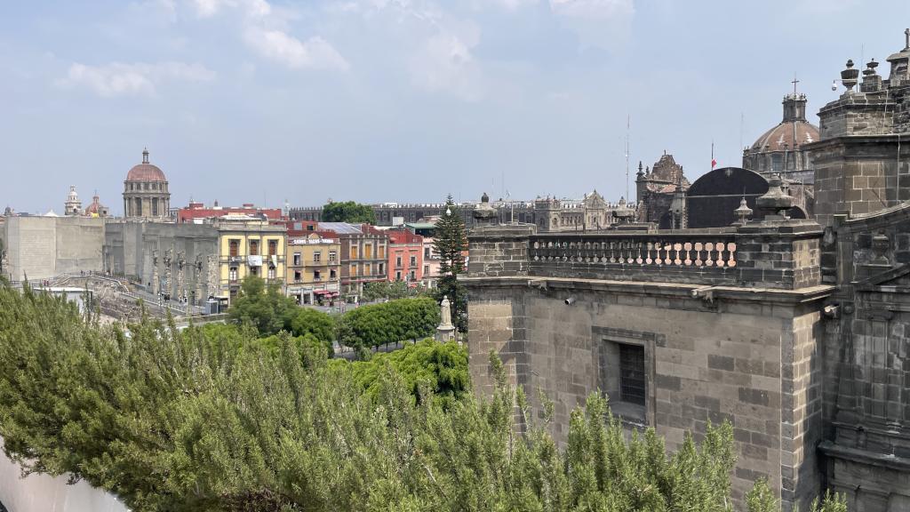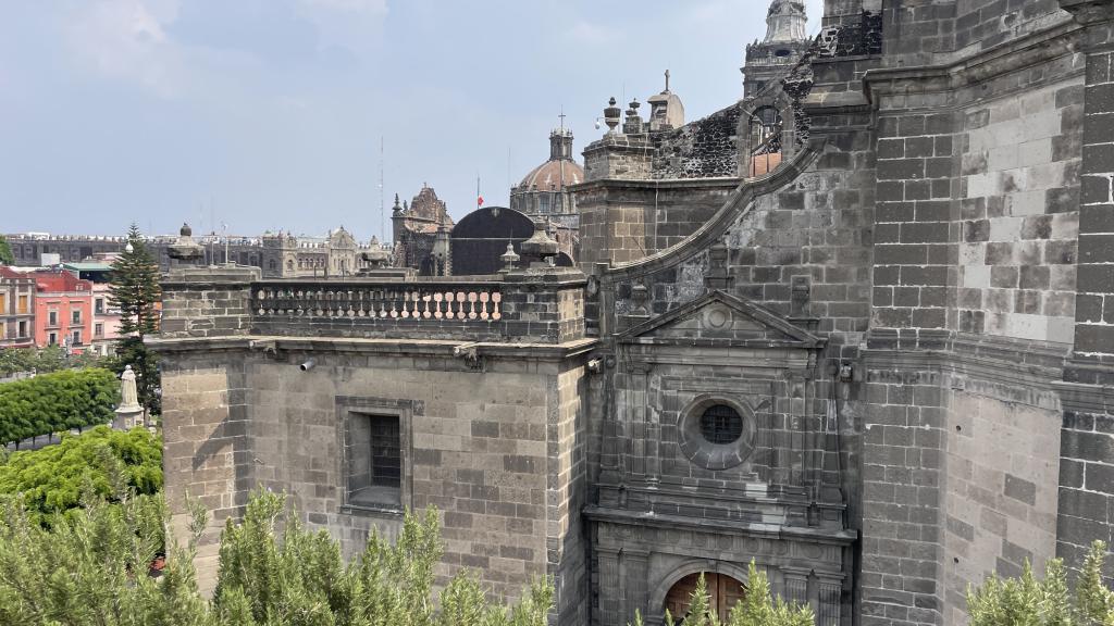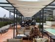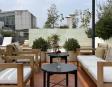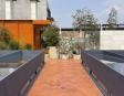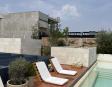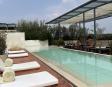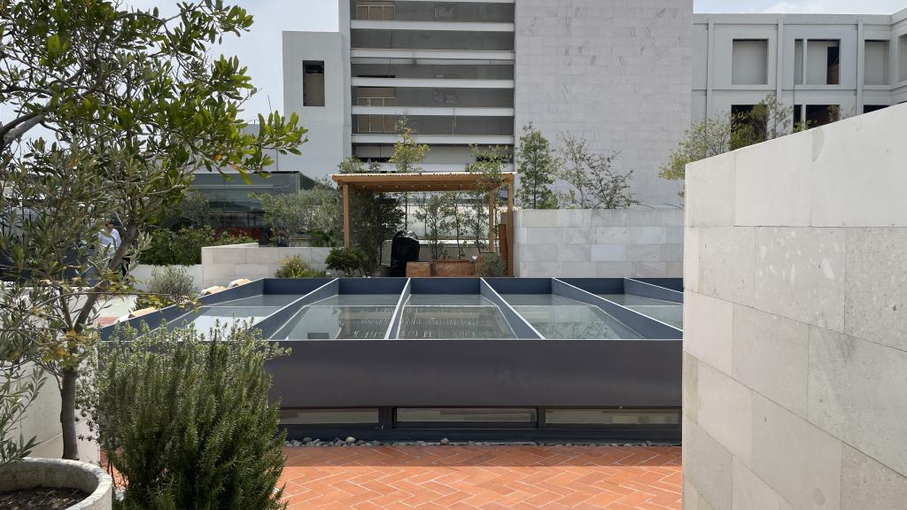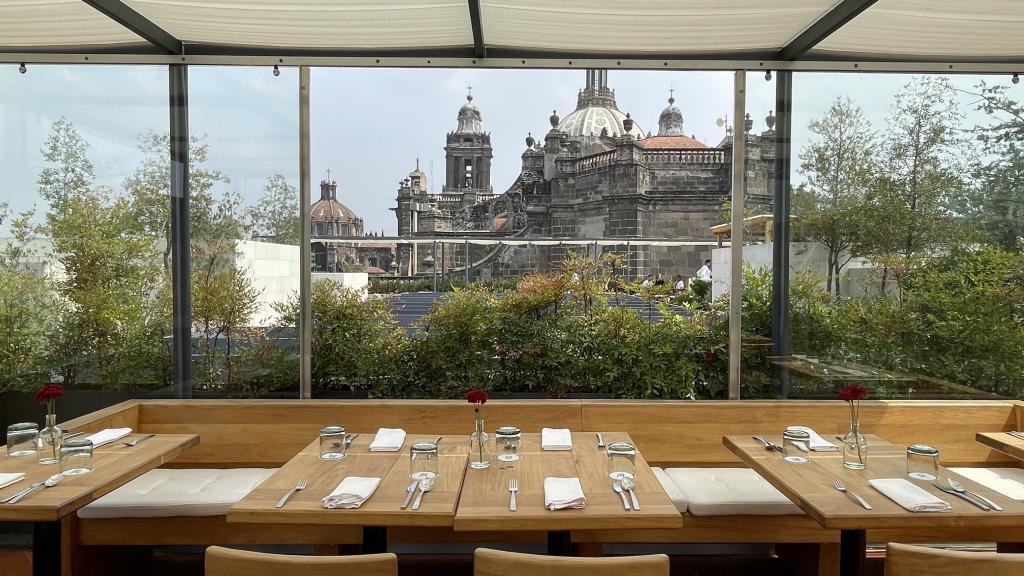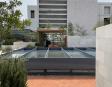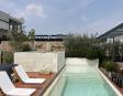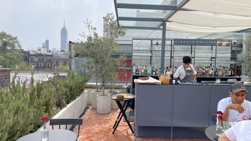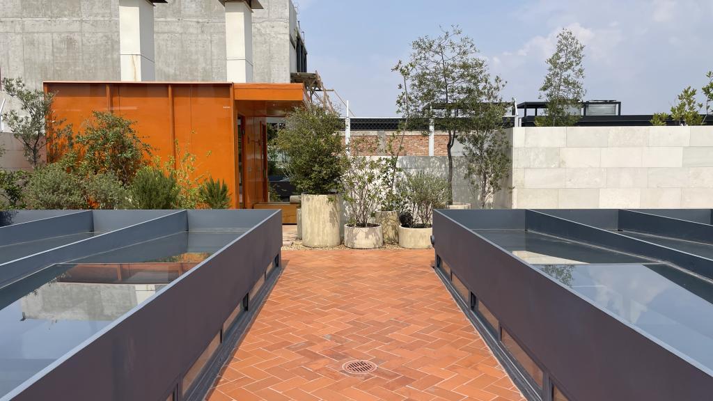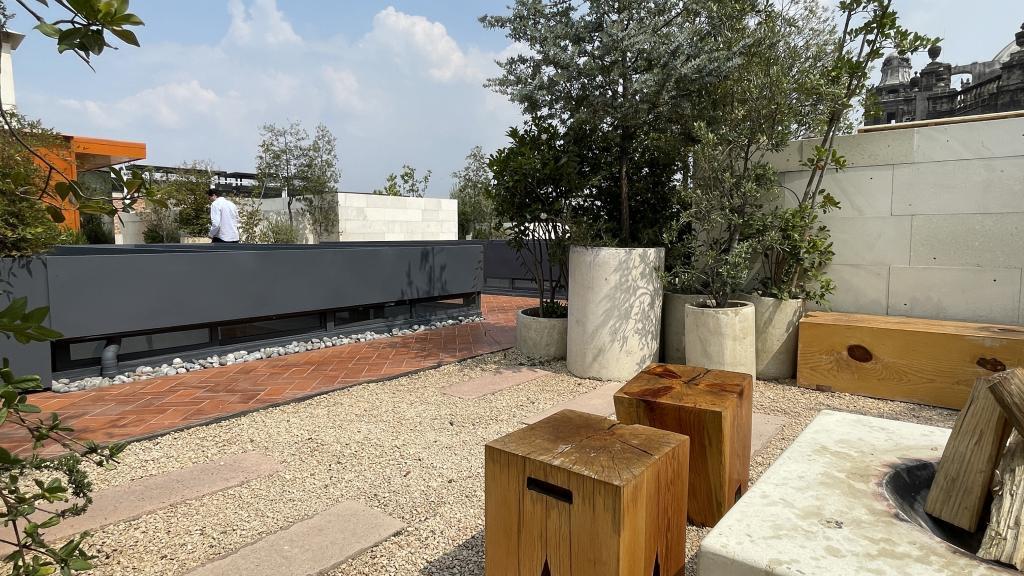 Alberca en la terraza del Hotel Círculo Mexicano, ubicado en el Zócalo de la CDMX. En edificio estilo colonial con detalles de decoración modernos.