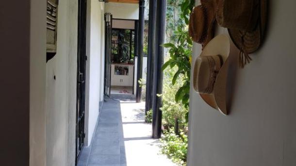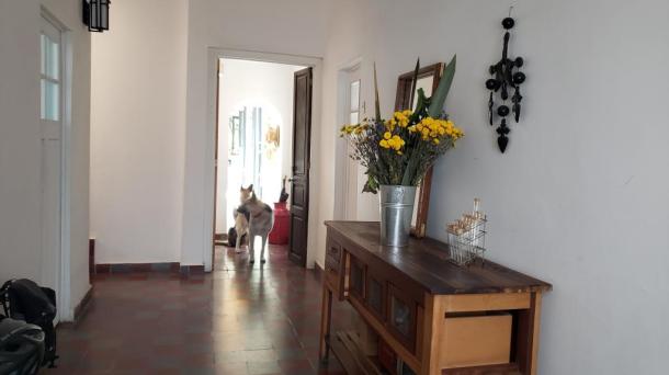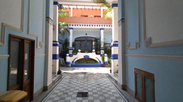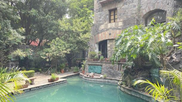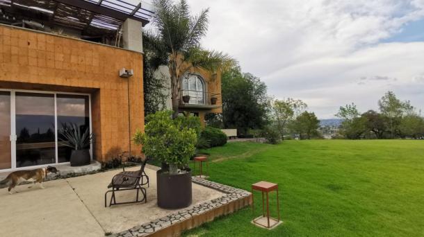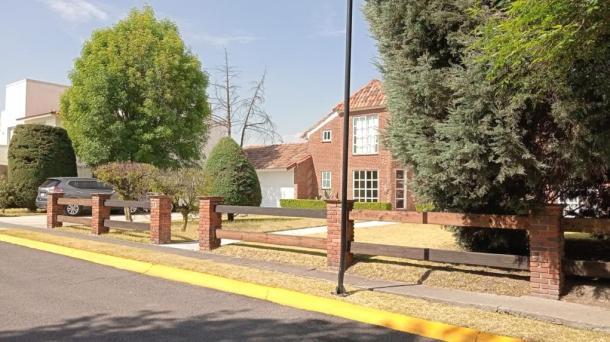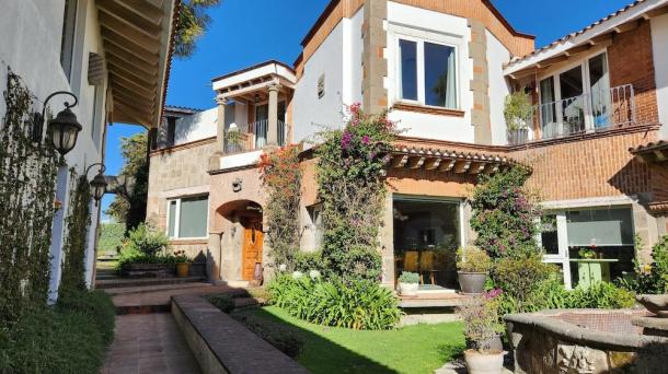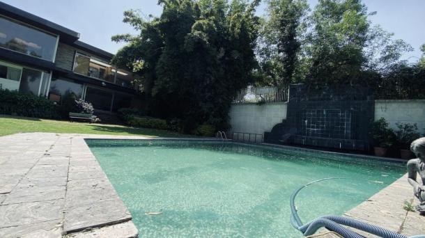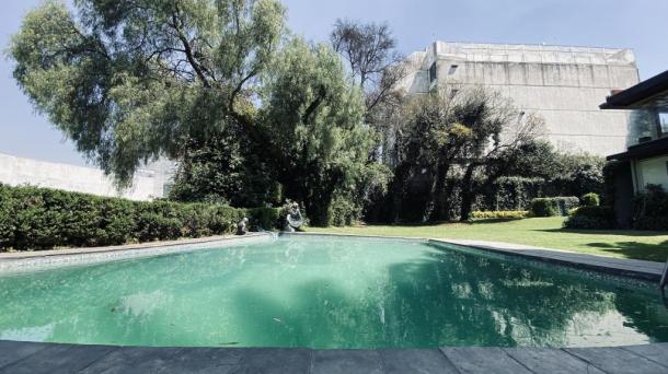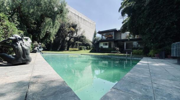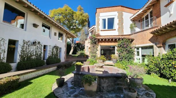 Albeerca dentro de una residencia privada. De fachada moderna. Con áreas verdes a los lados y una fuente moder...