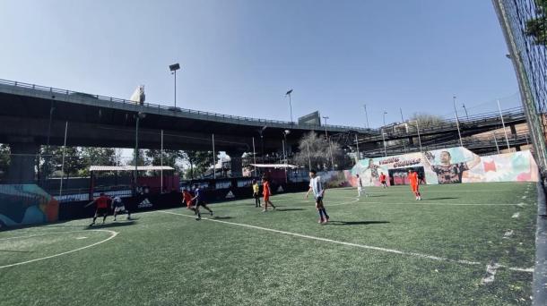 Cancha en espacio publico de fútbol 7. Decorada y pintada en colaboración con la marca Adidas. A un costado de...