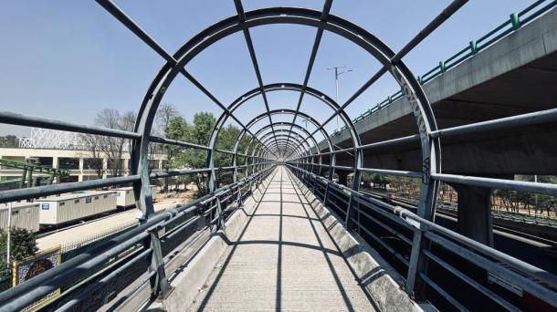 Andador y puente elevado en la segunda sección del bosque de Chapultepec. Tiene fuentes y fondos de edificios....