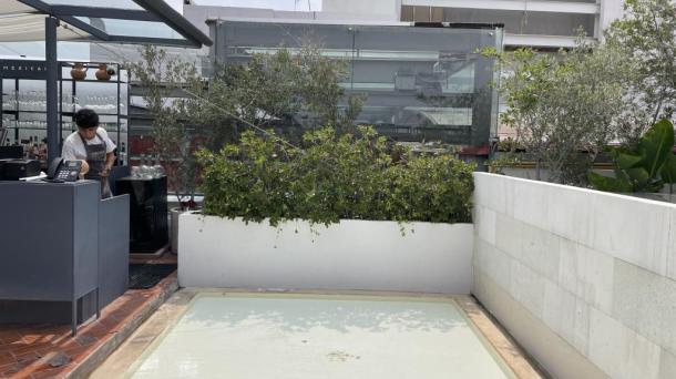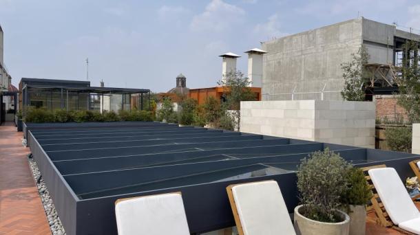 Alberca en la terraza del Hotel Círculo Mexicano, ubicado en el Zócalo de la CDMX. En edificio estilo colonial...