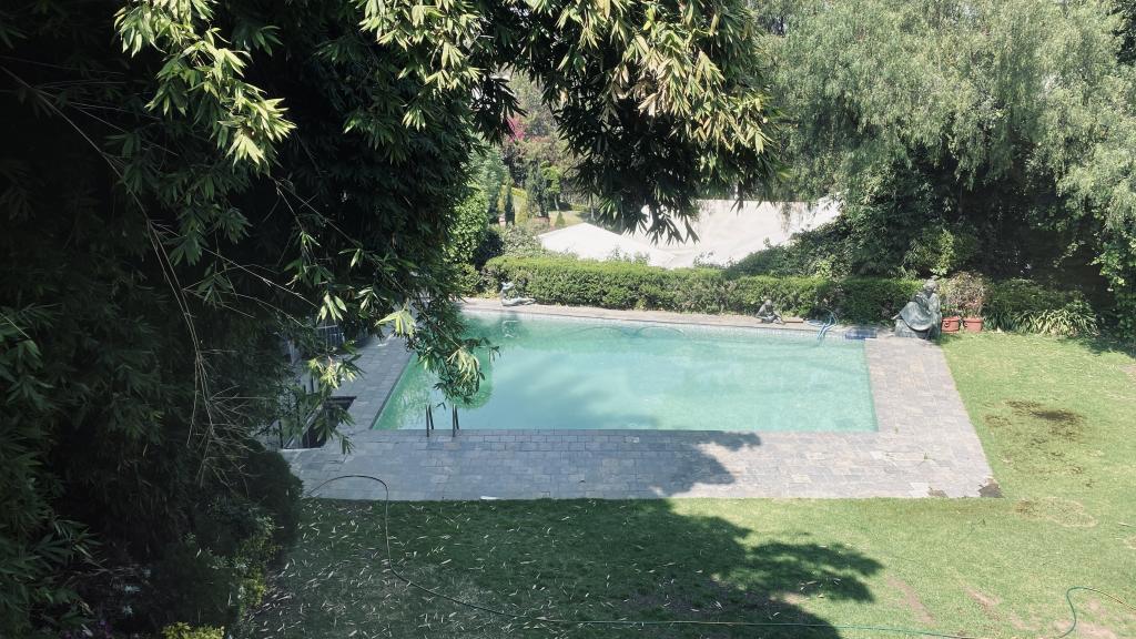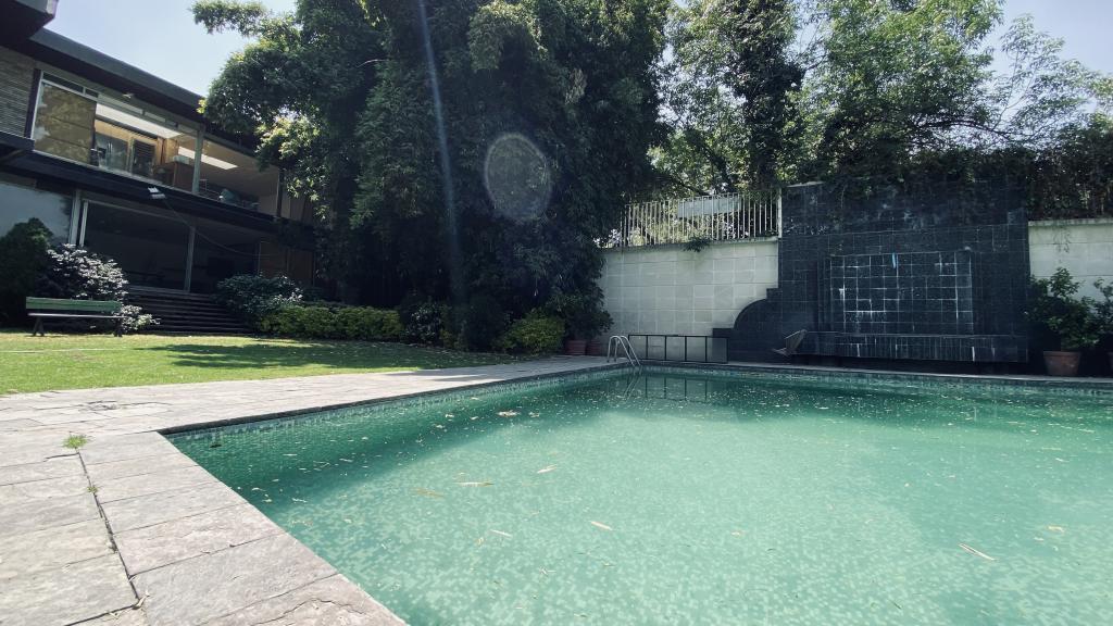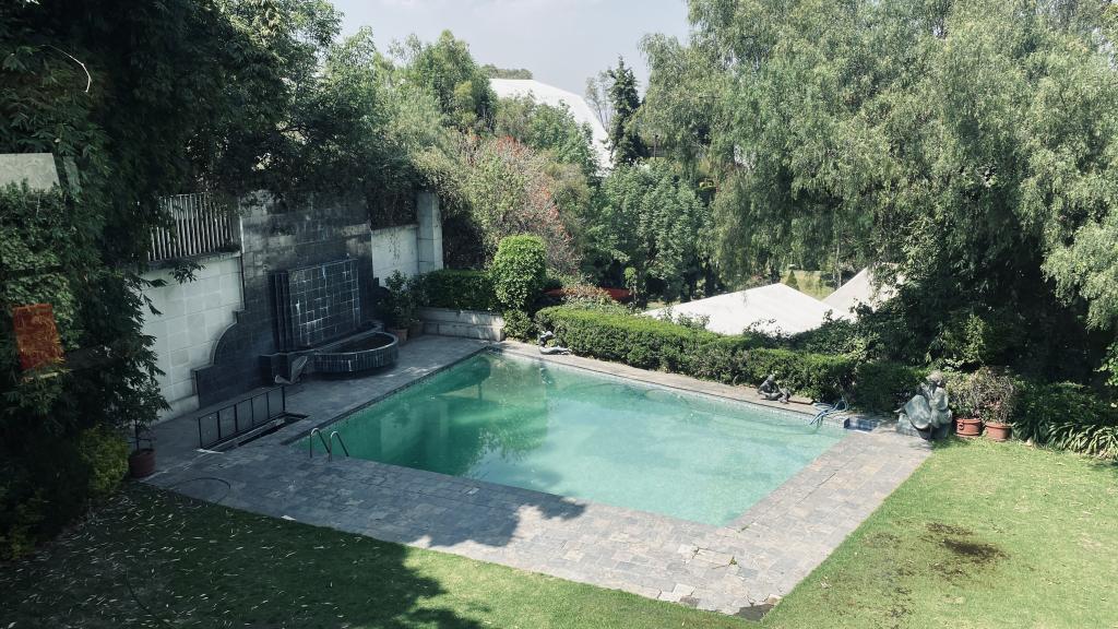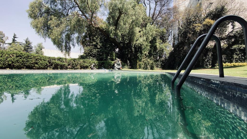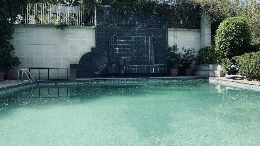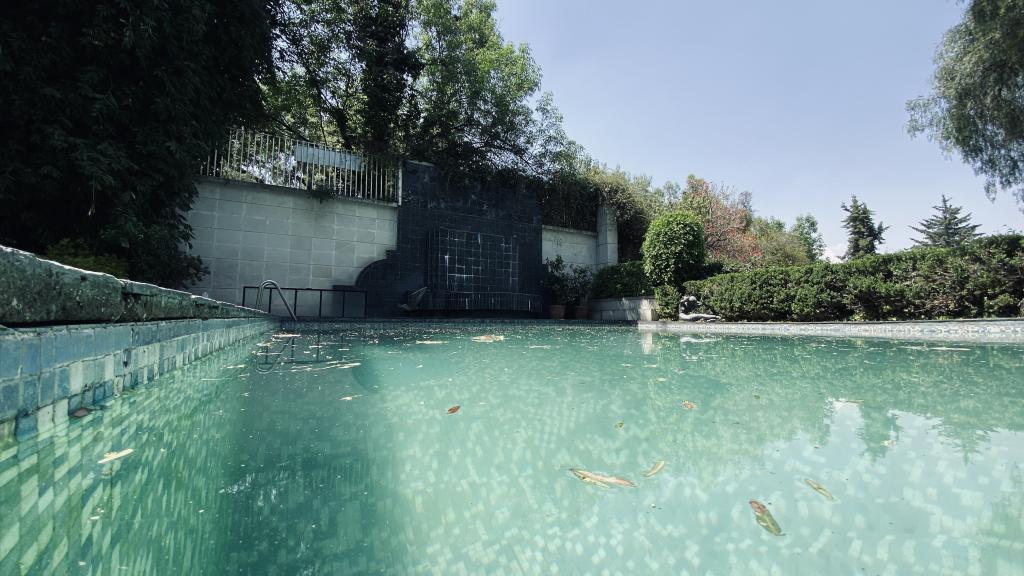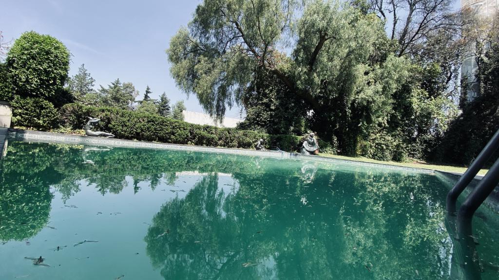 Albeerca dentro de una residencia privada. De fachada moderna. Con áreas verdes a los lados y una fuente moderna al frente de la alberca.