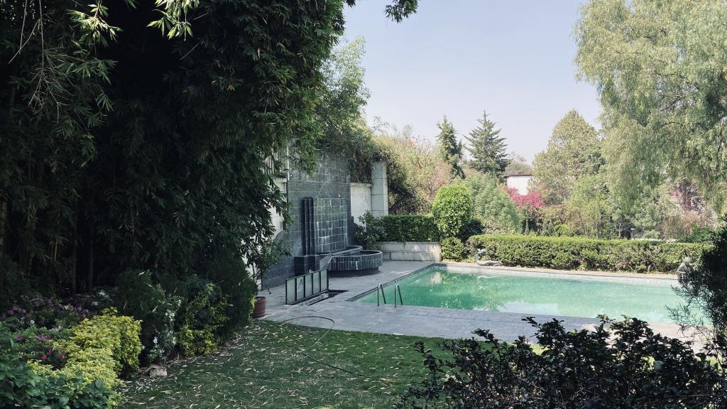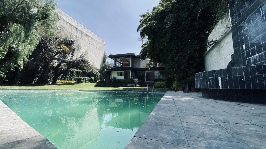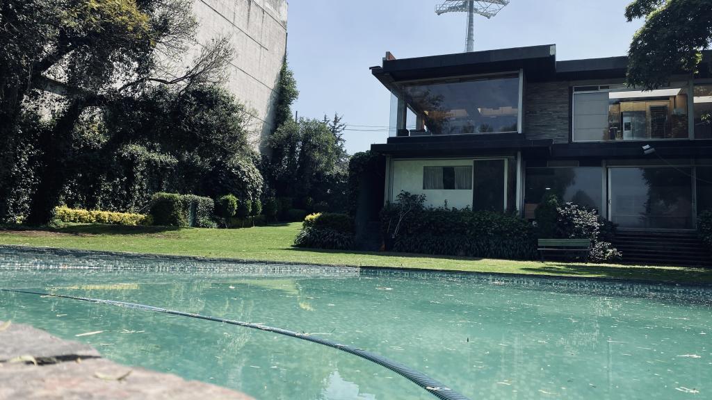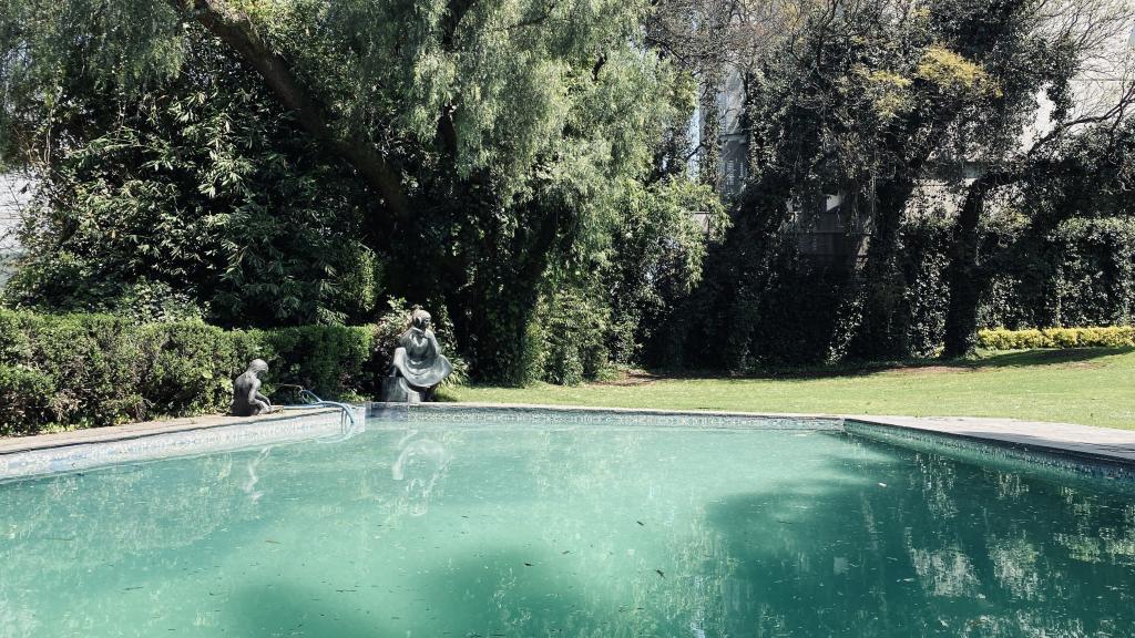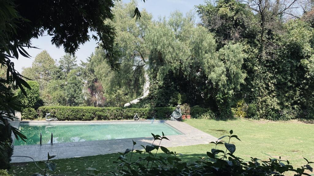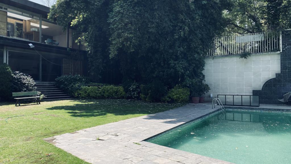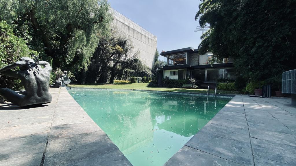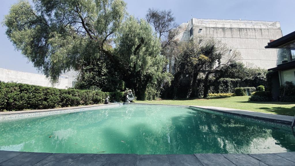 Albeerca dentro de una residencia privada. De fachada moderna. Con áreas verdes a los lados y una fuente moderna al frente de la alberca.