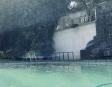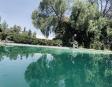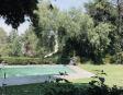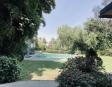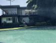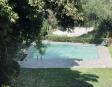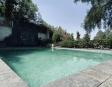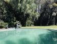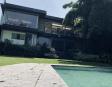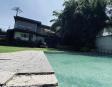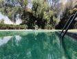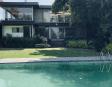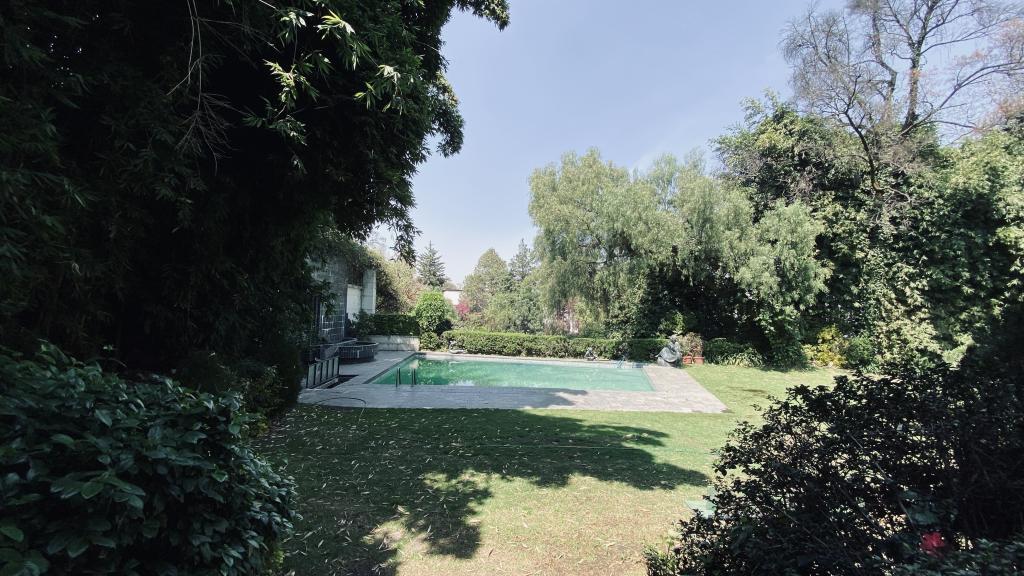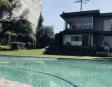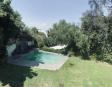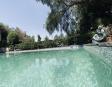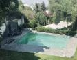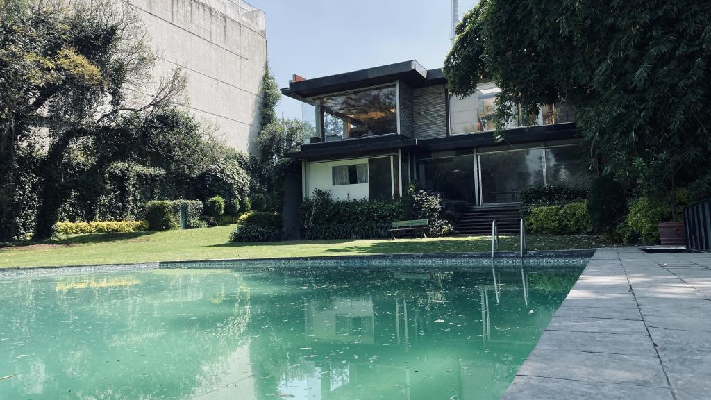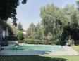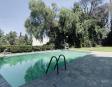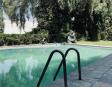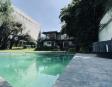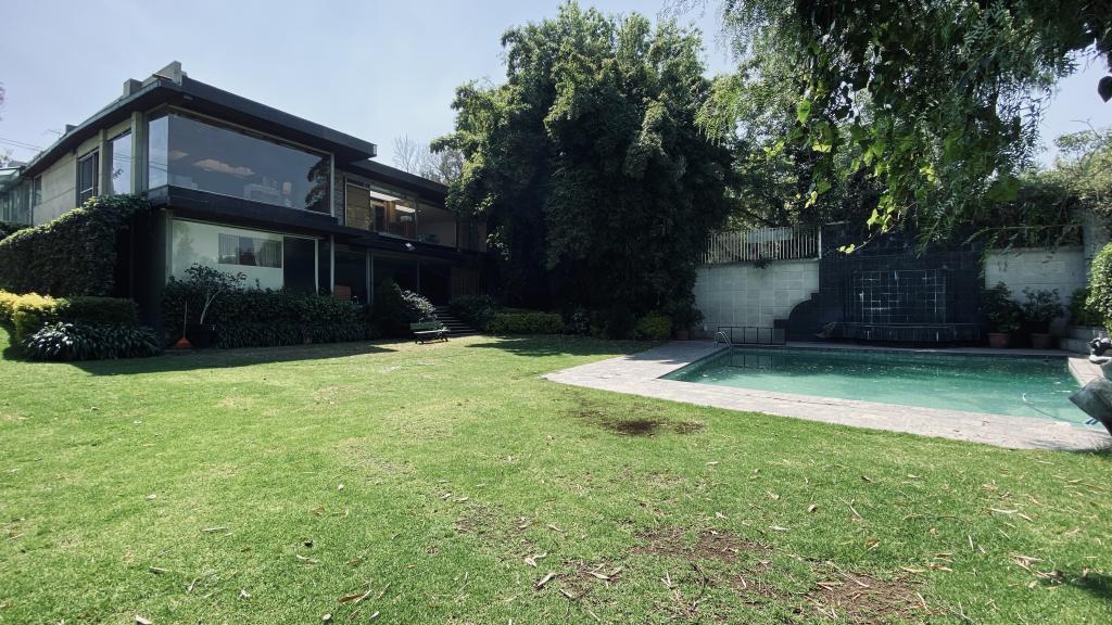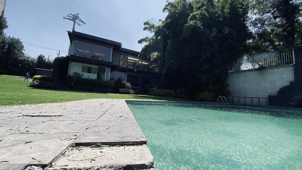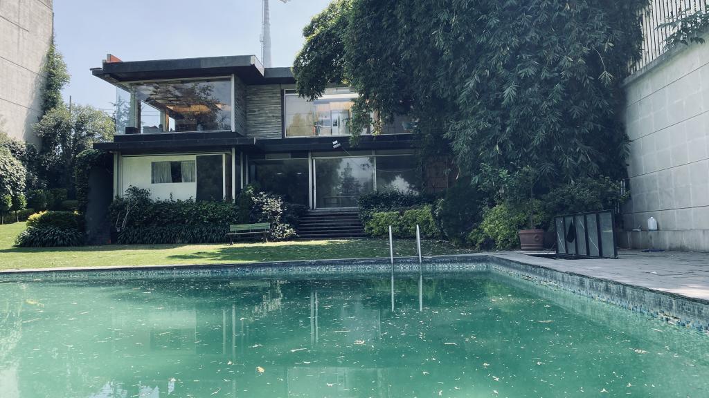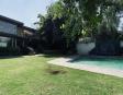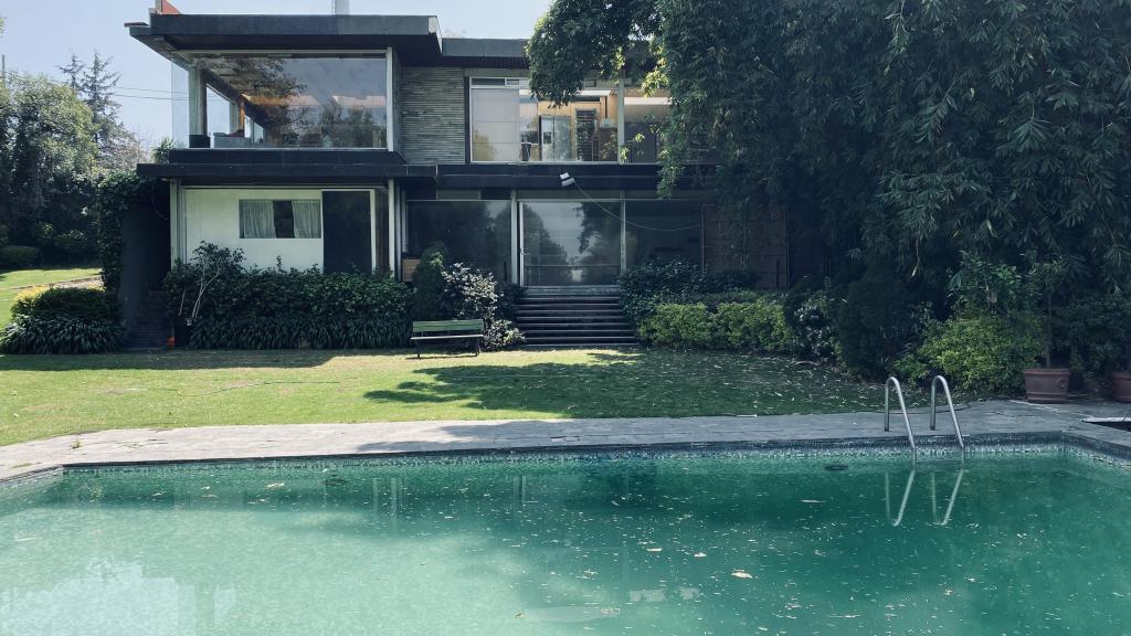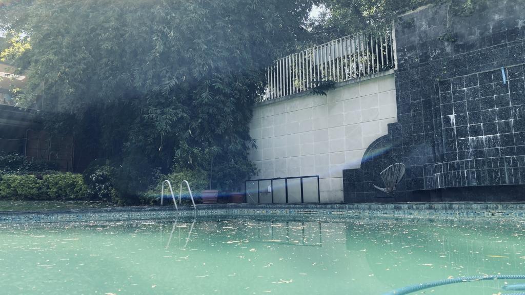 Albeerca dentro de una residencia privada. De fachada moderna. Con áreas verdes a los lados y una fuente moderna al frente de la alberca.