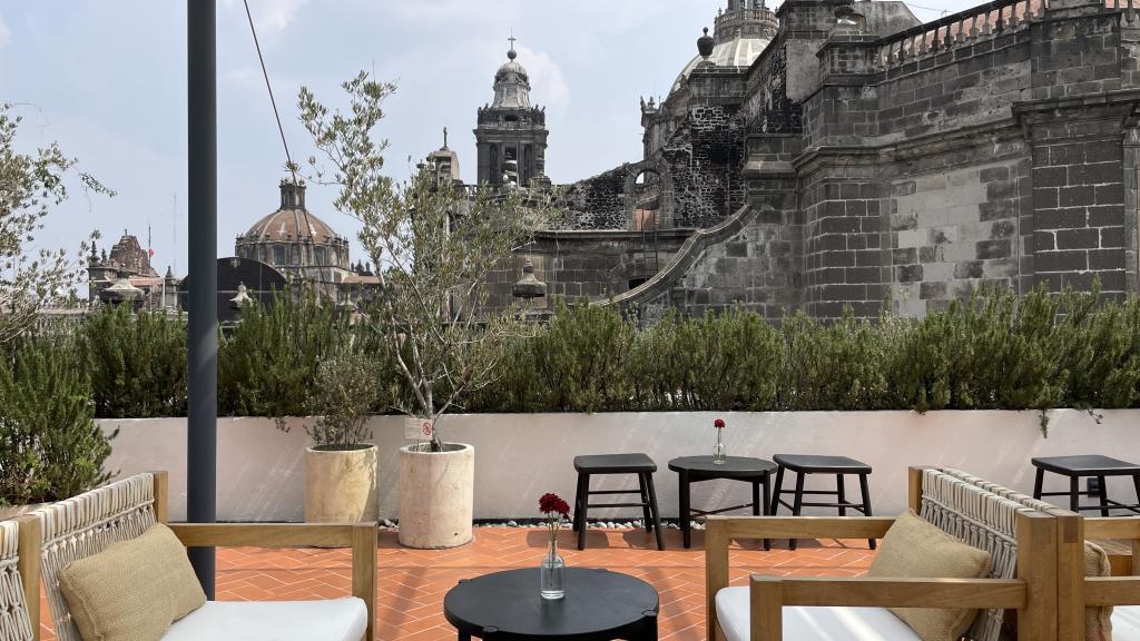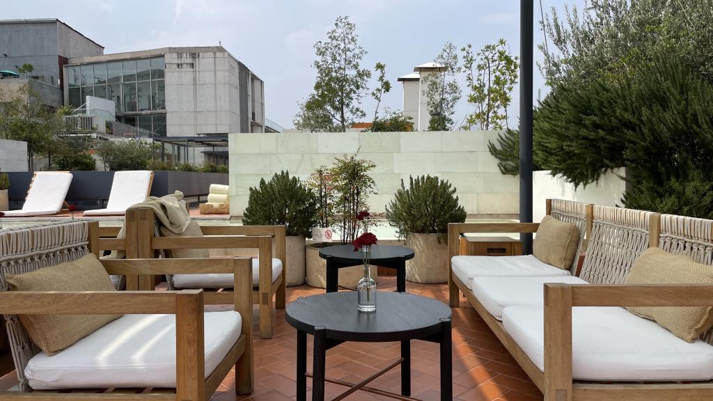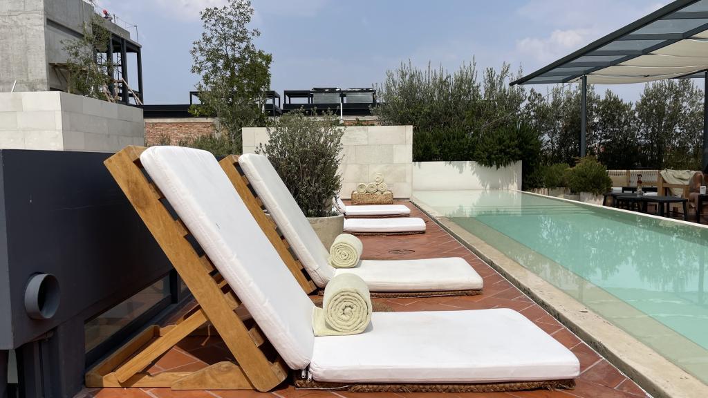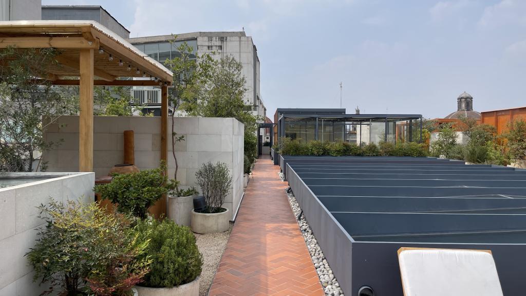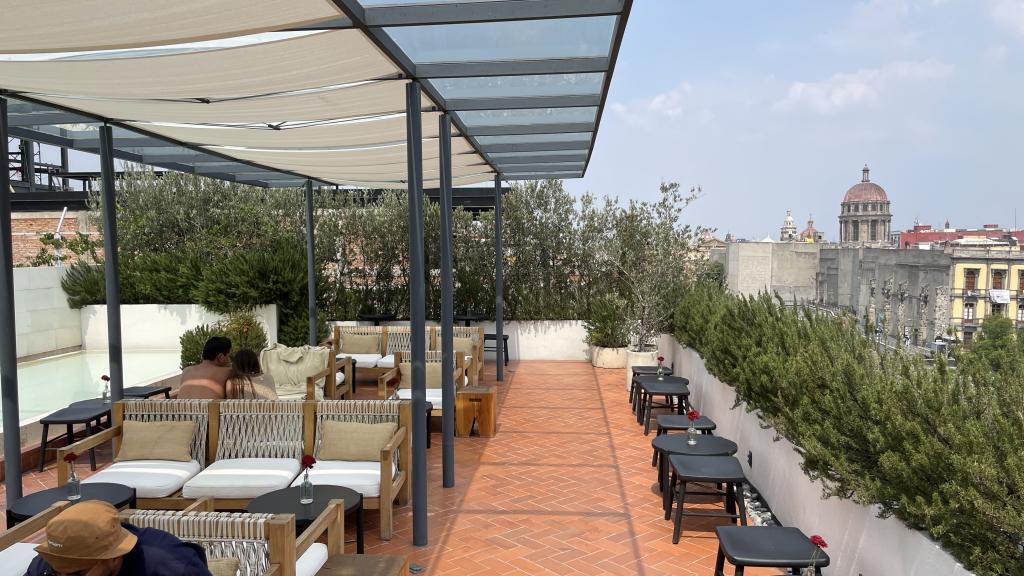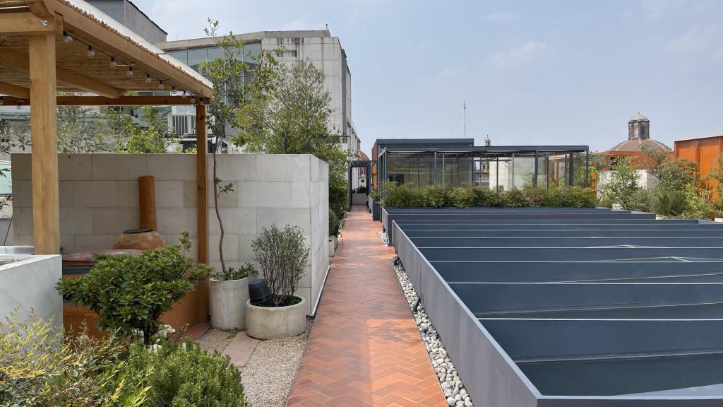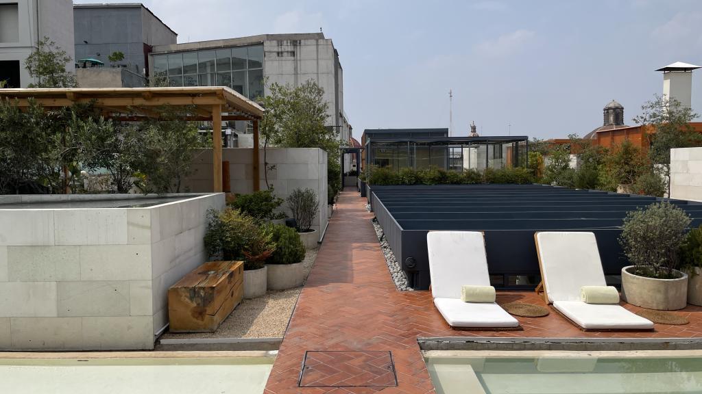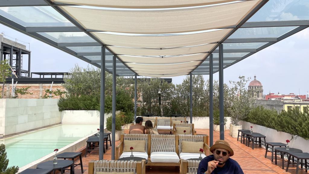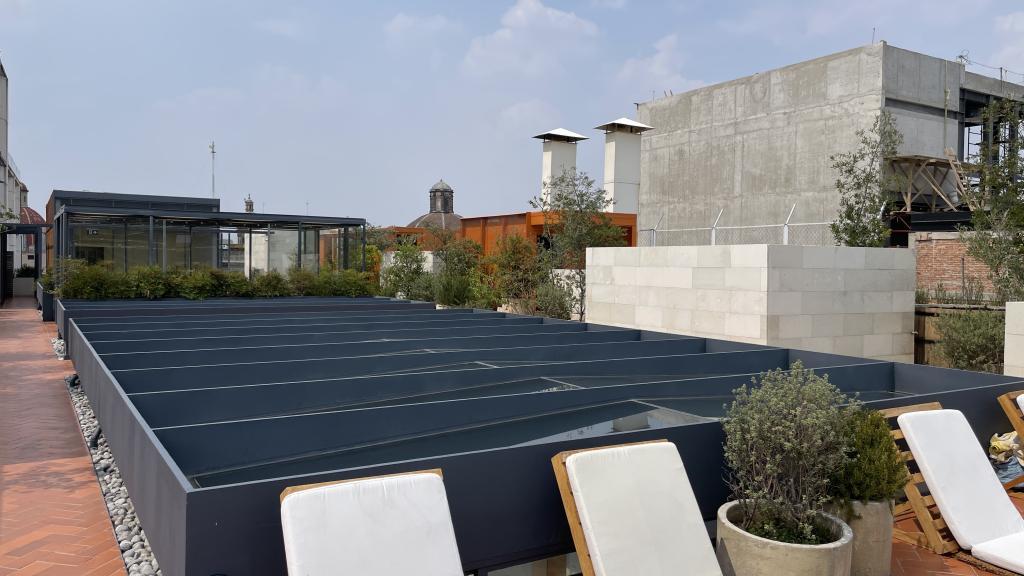 Alberca en la terraza del Hotel Círculo Mexicano, ubicado en el Zócalo de la CDMX. En edificio estilo colonial con detalles de decoración modernos.