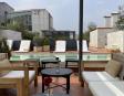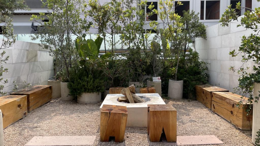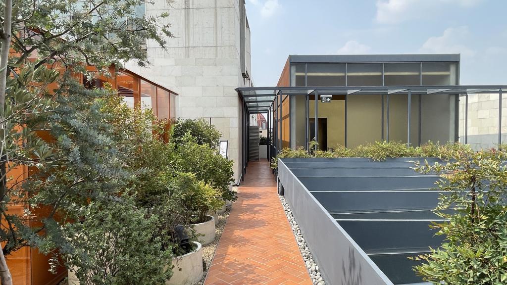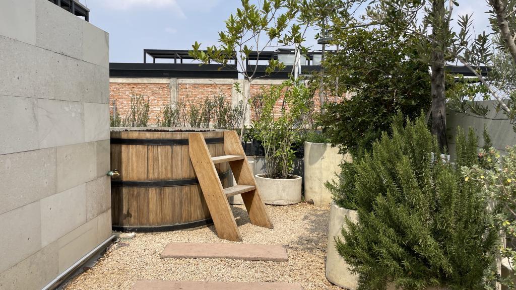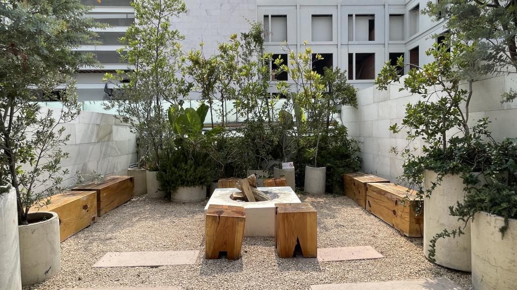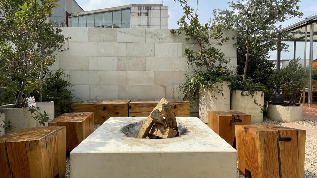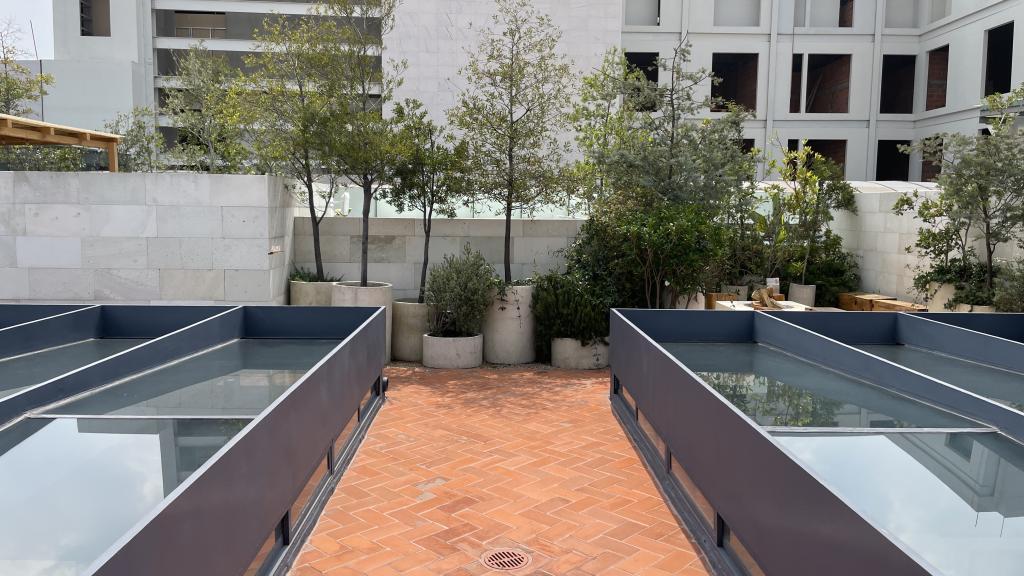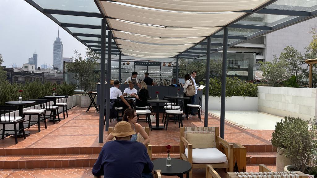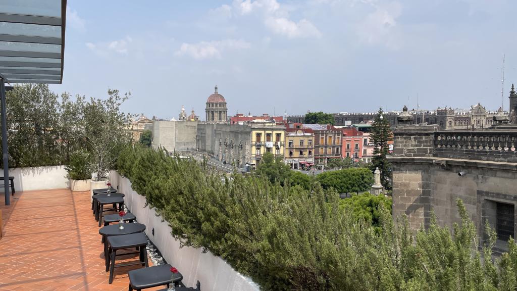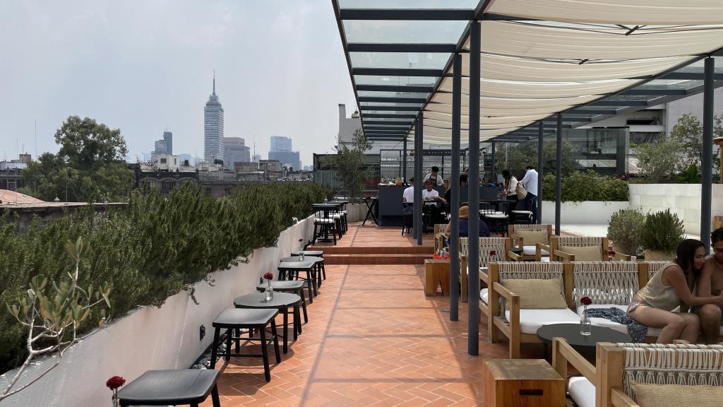 Alberca en la terraza del Hotel Círculo Mexicano, ubicado en el Zócalo de la CDMX. En edificio estilo colonial con detalles de decoración modernos.