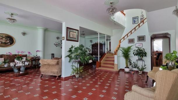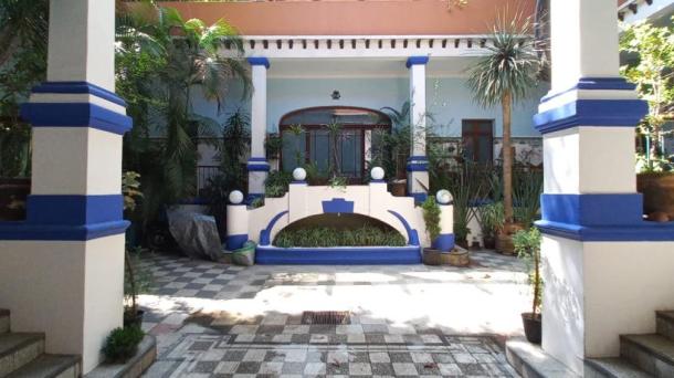 Albeerca dentro de una residencia privada. De fachada moderna. Con áreas verdes a los lados y una fuente moder...