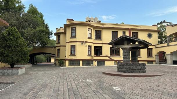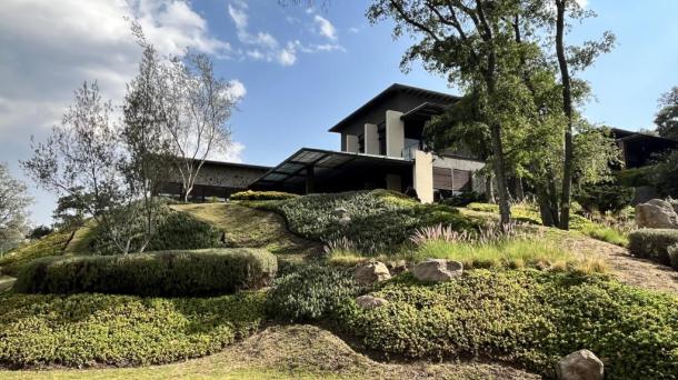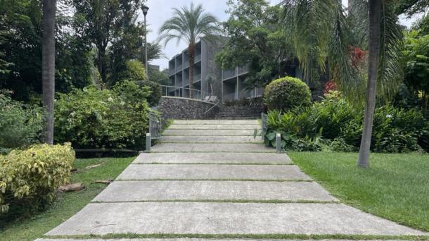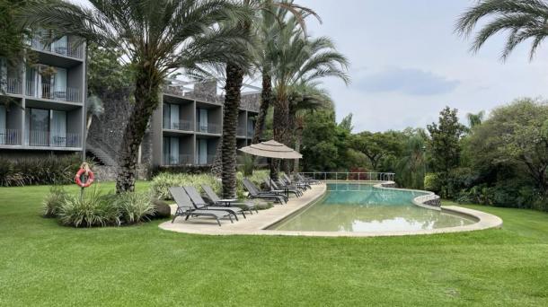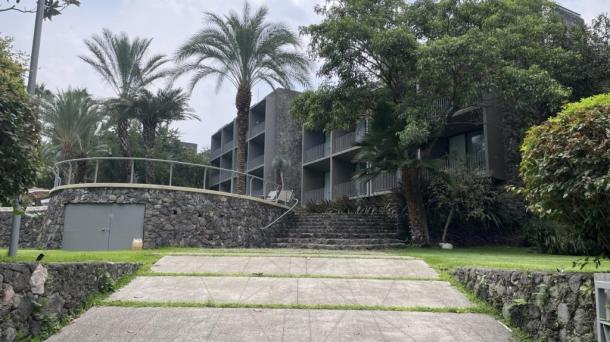 Hotel con alberca, de estilo brutalista.